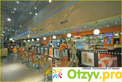 Как практически во всех кинотеатрах сейчас есть небольшие стойки-кафе, где можно купить поп-корн, напитки, сладости.
