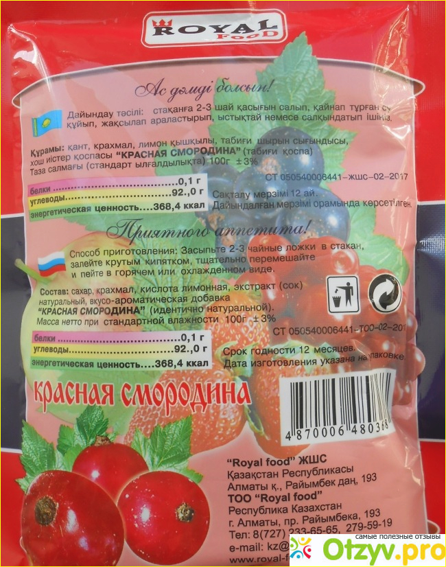 Желеобразность данному продукту придает такой ингредиент, как крахмал. Сколько себя помню, в продаже всегда были концентраты, позволяющие быстро приготовить кисель. Раньше это были брикеты с 2-3 вкусами, которые надо было растворять в воде и варить. В детстве я очень любила просто погрызть такой киселек. Недавно я увидела в продаже быстрорастворимые концентраты бренда Royal Food, производимые в Казахстане. Ассортимент вкусов очень широк, едва ли не всех ягод и плодов, плюс смеси. Я взяла на пробу Красную смородину, потому что очень люблю эту ягоду.