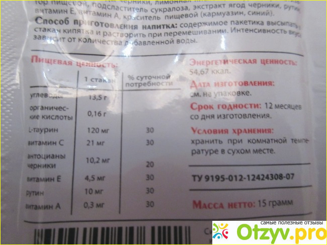 Не буду переписывать полностью состав киселя, его можно найти в интернете. В составе есть ягоды вишни и черники, соки, экстракты и витамины. Правда, имеется пищевой краситель (кармуазин) и пищевой ароматизатор.