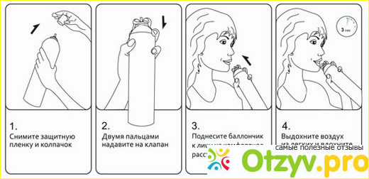 - необходимо воздух из легких выдохнуть, нажать на баллончик и вдохнуть воздух из него. Нажимать баллончик рекомендуется три-пять раз.