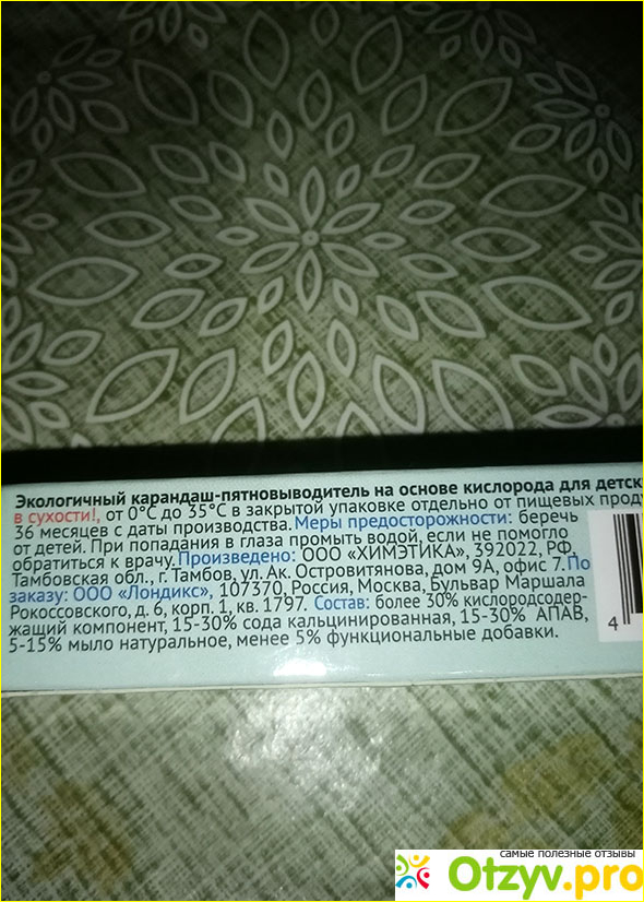 И, что важно, пятновыводитель не агрессивный, ткань от соприкосновения с ним не страдает. Карандаш белого цвета, в нем нет красителей, хлора, фосфатов и др. опасной химии. Можно спокойно применять его для детских вещей