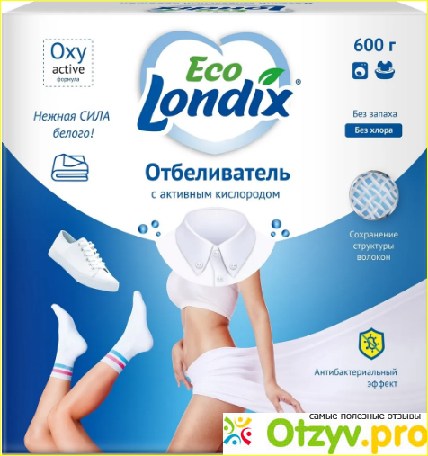 Что мне еще понравилось в отбеливателе Eco Londix – это состав на основе безопасных компонентов, без хлора, фосфатов, отдушек. Главный компонент – активный кислород, он не разъедает ткань, полностью вымывается и безвреден для аллергиков. Действительно «нежная сила», как говорится на упаковке. Еще прикольно, что этим отбеливателем можно даже ванную чистить. Очищает хорошо, кстати.