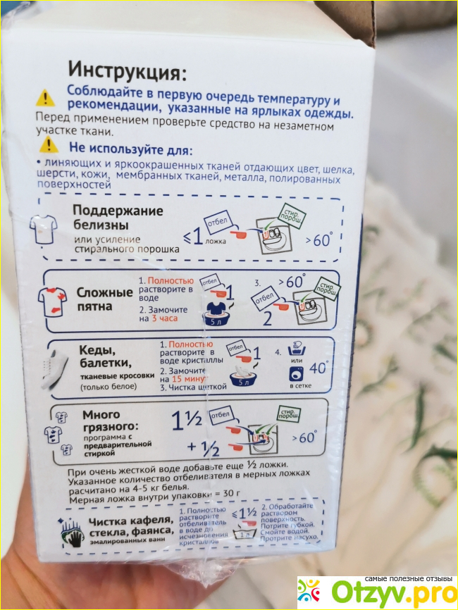 Не стала замачивать, решила посмотреть как этот отбеливатель справится при добавлении к порошку. Всё сделала по инструкции: температура стирки 60 градусов, количество отбеливателя отмерила специальной ложкой, которая была в коробке, что очень удобно.