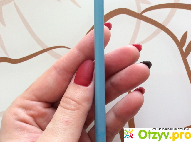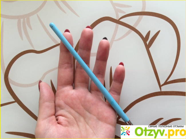 Данная кисть имеет приятный внешний дизайн. Её основание выполнено из дерева, достаточно длинное и толстое. Эту кисть удобно не только хранить, но и держать в руке при работе. Основа покрыта голубой краской, которая нанесена очень качественно, без проплешин и зазубрин. Из украшений на кисти есть только название марки, нанесённая в центре основы чёрным цветом.