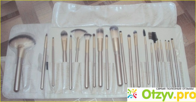 Кисти идут в упаковке из искусственной кожи в красивом молочном цвете, упаковка играет бликами на свету. Упаковка достаточно прочная, пользуюсь больше года еще нигде ничего не разошлось, оторвалось. В моём наборе двадцать две кисточки. Вот так они смотрятся: