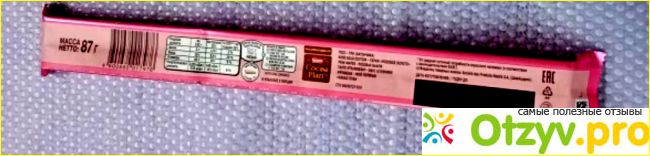 Сзади на упаковке информация. В составе сначала идет сахар, потом масло какао, после этого сухое цельное молоко. Потом идут мука пшеничная и жир специального назначения, в который входит и пальмовое масло среди других ингредиентов. Состав длинный, весь расписывать, думаю, смысла нет. Понятно, что состав не идеальный. Масса НЕТТО 87 грамм.