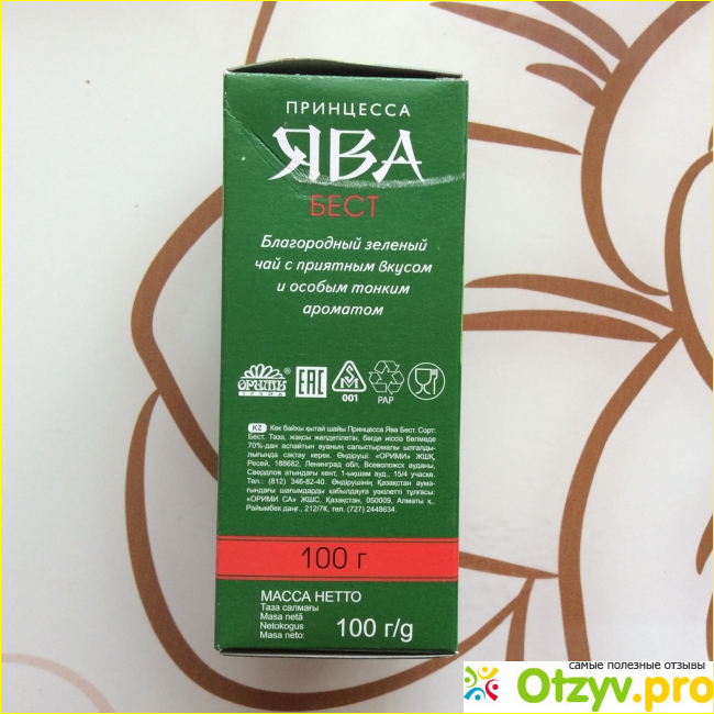 В число информации входит состав, правила заваривания, правила хранения, срок годности, также контактная информация о производителе. Листья зелёного чая внутри коробочки сохраняет герметичный пакет из фольги, который имеет герметично спаянные швы. Глядя на него можно с уверенностью сказать, что после изготовления этого зелёного чая и до момента заваривания на нашей кухне этот чай был в целости и сохранности.