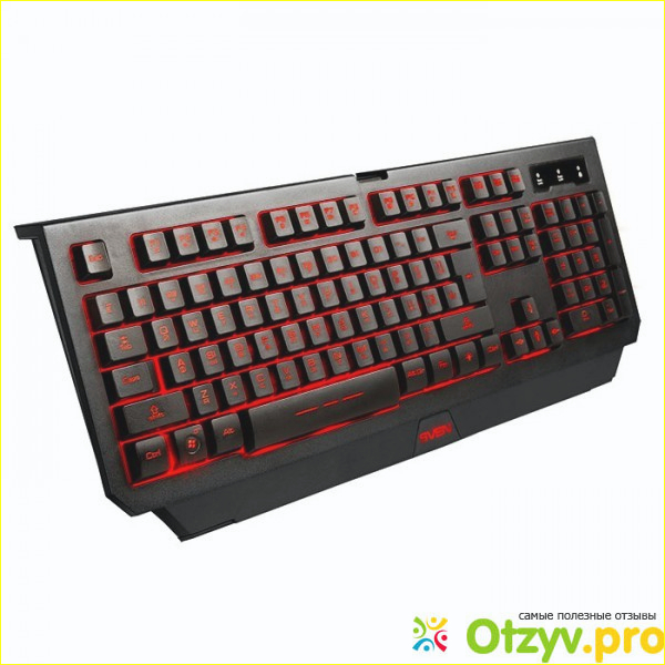 По поводу подсветки. Диапазон цветов — от синего до красного (т. е. синий, фиолетовый, красный). Можно регулировать интенсивность свечения выбранного цвета. Желтого и зеленого нет. Подсвечиваются символы на клавиатуре, контур клавиши и логотип SVEN внизу, который так и хочется заклеить, чтобы не отвлекал. В итоге все-таки заклеил.