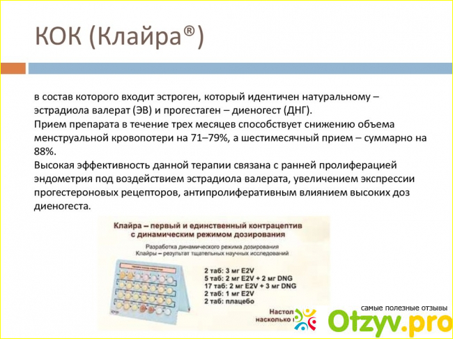 Это комбинированный пероральный контрацептив в форме таблеток. Его действие основано на стандартном подавлении овуляции, а также на изменении вязкости цервикальной слизи, что препятствует проникновению сперматозоидов в матку. Кроме собственно противозачаточных свойств, Клайра оказывает и лечебный эффект. Например, позволяет стабилизировать и отрегулировать менструальный цикл, избавиться от болезненности в период ожидания менструации, снизить количество кровяных выделений и избежать рисков железодефицитной анемии.