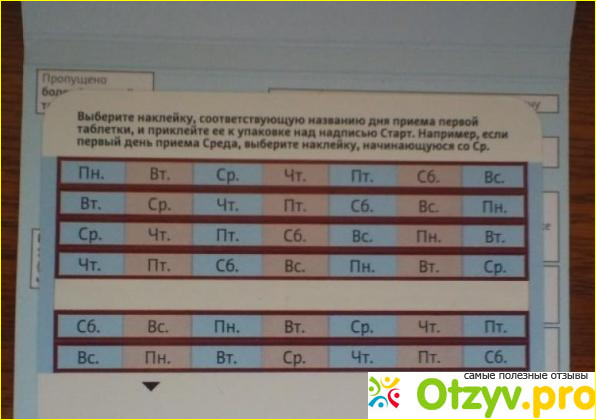 Таблетки можно полностью закрыть и взять с собой, можно пользоваться календарем, который показывает дни недели. Под наклейкой хранится памятка, в которой написано, что предпринять, если таблетка вовремя не была выпита. Но на самом деле невозможно забыть выпить таблетку, если скачать программу - напоминание на телефон или заводить будильник на определенное время. Принимать таблетки нужно в одно и то же время.