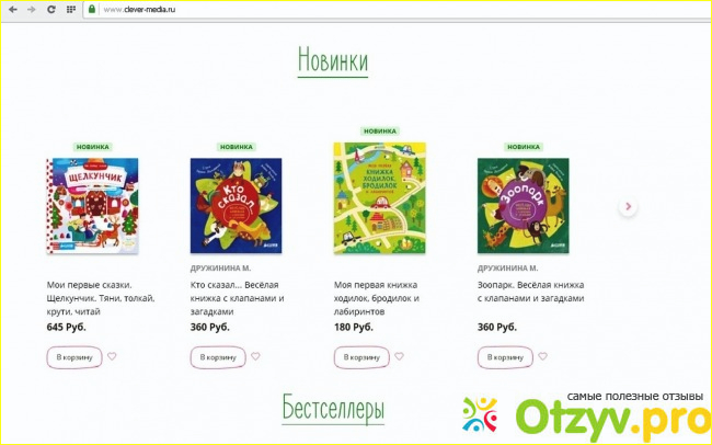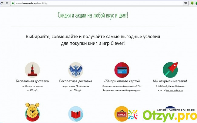 Этот сайт с интересным названием "Клевер" (www.clever-media.ru) мне понравился с первого взгляда. Очень милое оформление: мишка из мультика, самолётики, подарки, всё мелькает. А на третьей полосе сверху отчетливо видны категории "Бестселлеры", "0-3 года", "4-6", "7+", "для родителей", "игрушки". Создаётся впечатление, что он полностью ориентирован на детей и их родителей.