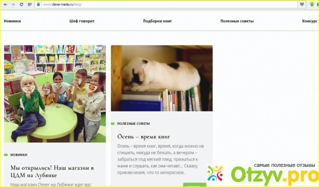 Это особенно интересный и приятный раздел. Потому, что тут есть что почитать. Очень мило смотрится спящий на книгах котёнок. Эта осенняя статья просто переполнена изображением различных котиков. Их чешут, они играю и танцуют, - милые пушистики! А ведь это всего лишь обзор книг. Авторы сайта точно знают чем завлечь детей и их мам. На пап, я думаю, появление котиков не сильно повлияет. Можно почитать про книжки для малышей, также про любимых персонажей издательства. Рассказывают о книгах для подростков или для путешествий. В общем блог - это не просто новости, это подборка статье о разных книгах и разбивка их на некоторые категории с долей полезной информации.