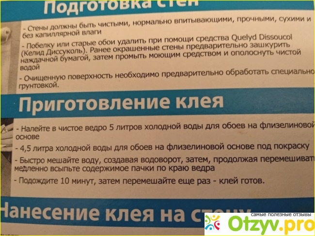 На упаковке есть подробная инструкция где рассказано как нудно приготовить клей и как правильно его наносить. Также об этом нам рассказал продавец-консультант, и ответил на все наши вопросы.