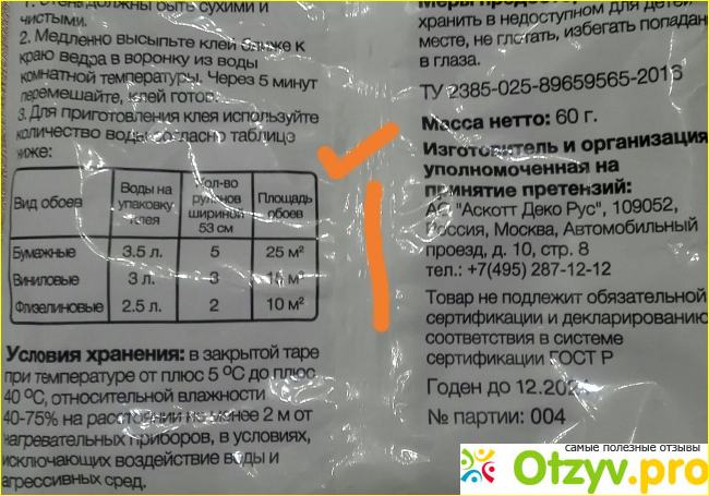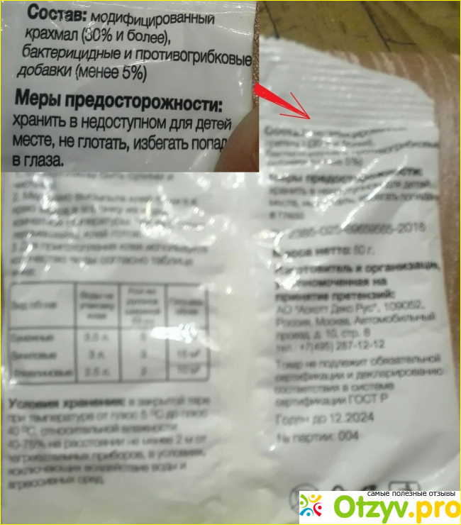 Кроме того, интересно было сравнить состав этого пакетика с фирменными известными смесями. Основа одинаковая – модифицированный крахмал (сразу советский клейстер вспомнила, на который и сажали обои в стародавние времена). Но вот бактерицидных и противогрибковых добавок в столь бюджетном варианте намного меньше. Так что либо пользуйте его в сухих и солнечных помещениях, либо проводите дополнительную предварительную обработку соответствующими спецсредствами. Кстати, очень странным показалось процентное соотношение компонентов: крахмала – более 30%, добавок – менее 5.