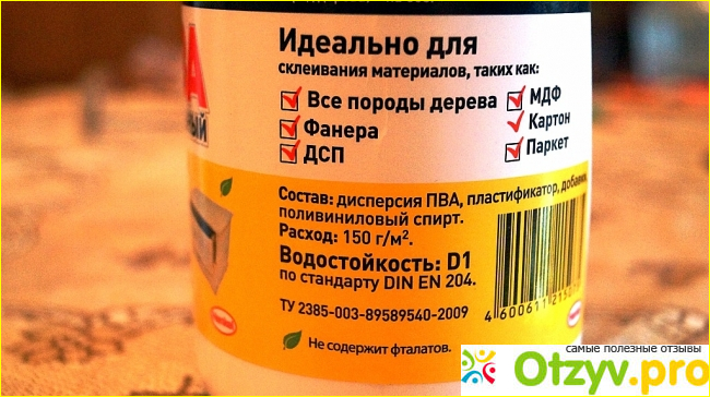 Надо отметить, что данный клей не содержит фталатов, состав его включает в себя следующие компоненты: дисперсия ПВА, пластификатор, добавки, поливиниловый спирт.