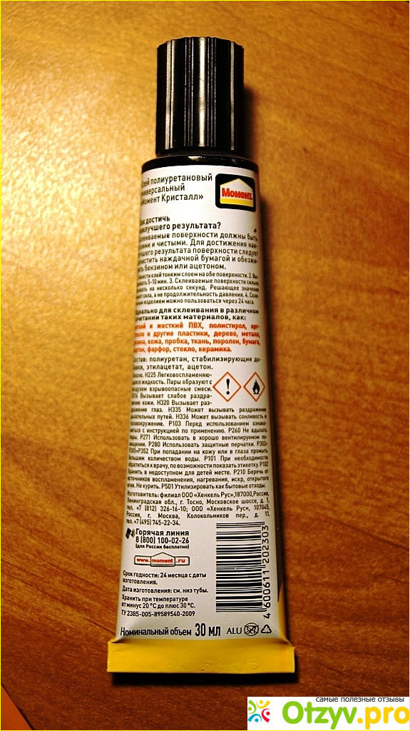 Продается он в тюбике из фольги ёмкостью 30 мл. Вроде бы немного, но данного тюбика хватает, лично в нашей семье, на достаточно долгое время. Срок годности его 24 месяца со дня изготовления, дата изготовления указана на самом тюбике. На тюбике также есть вся необходимая информация для покупателя. Это, прежде всего, инструкция, как достичь наилучшего результата при работе с ним, его состав (полиуретан, стабилизирующие добавки, этилацетат, ацетон), изготовитель и другая полезная информация. Тюбик имеет откручивающуюся крышку черного цвета. Открутив её, мы видим жало, через которое можно выдавливать клей. При такой конструкции тюбика кисточкой можно и не пользоваться.Есть у данного товара и меры предосторожности. Так как клей легко воспламеняется, то его надо держать вдали от открытого огня, также клей из-за своего состава может вызвать раздражение кожи и глаз. Поэтому с ним надо работать с защитными средствами и держать вдали от детей.