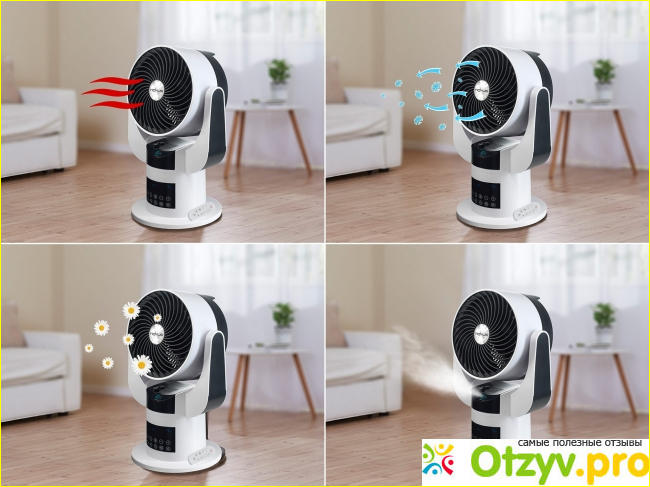Позволяет освежить воздух в помещении быстро и эффективно. Воздух подается в трех режимах: нормальный, естественный, циркулирующий (вентилятор вращается влево-вправо, вверх-вниз, при этом выбирается скорость вращения). Управление очень простое, думаю не стоит заострять на этом внимание.