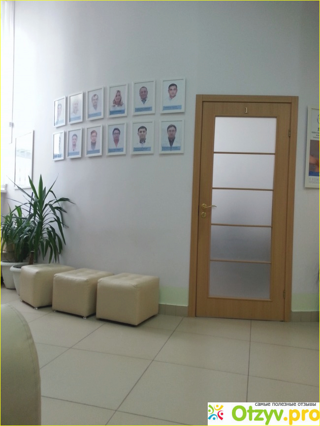 На стене - стенды с информацией о медперсонале клиники, фотографии сотрудников.