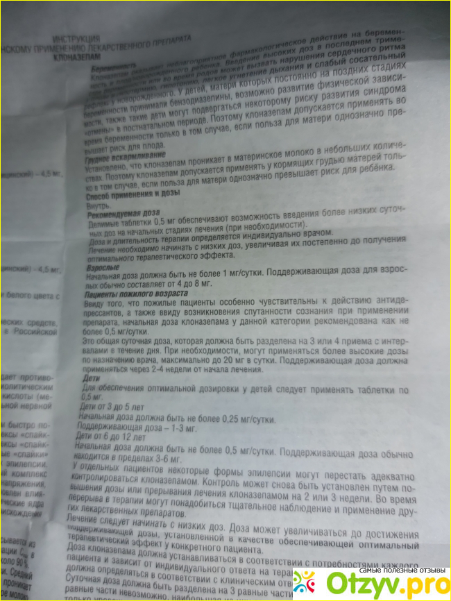 Беременность. клоназепам противопоказан в первом триместре беременности из-за риска пороков развития плода. Если пациентку лечат клоназепамом во время беременности, подумайте, стоит ли продолжать ту же терапию или перейти на другое противоэпилептическое лекарство. На самом деле важно, чтобы противоэпилептическая терапия не прекращалась во время беременности, поскольку обострение заболевания (неконтролируемая эпилепсия) является фактором риска для здоровья как матери, так и ребенка. Для снижения риска эмбриофетальной токсичности у женщин с эпилепсией при медикаментозной терапии рекомендуется: предпочесть режим монотерапии по сравнению с комбинацией большего количества противоэпилептических препаратов (в случае полипрагмазии повышен риск врожденных пороков развития); вводить противоэпилептическое лекарство в минимальной эффективной дозе, контролировать уровень в крови избегать пиковых концентраций в течение дня (т. е. использовать разделенные дозы противоэпилептического препарата); совместно управлять фолиевой кислотой.