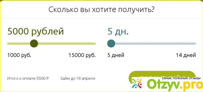 Выбирая параметры, нужно помнить, что за пользование средствами придется платить 2% от суммы в день. То есть, занимая 5000 рублей на 5 дней, отдать должны уже 5500 рублей.