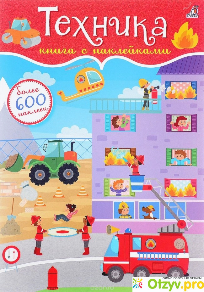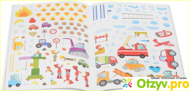 Эта книга действительно смогла надолго увлечь моего ребенка. Да и мне она нравится, чего скрывать-то?) Мне нравится, что ребенок может знакомиться с разными видами техники, профессиями, тем, как нужно вести себя в разных экстремальных ситуациях. Наклейки многоразовые, так что, если малыш наклеил что-нибудь неправильно, очень легко переклеить.