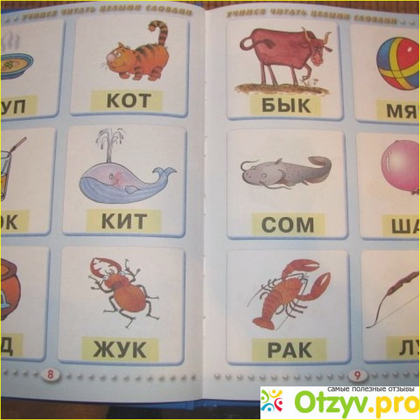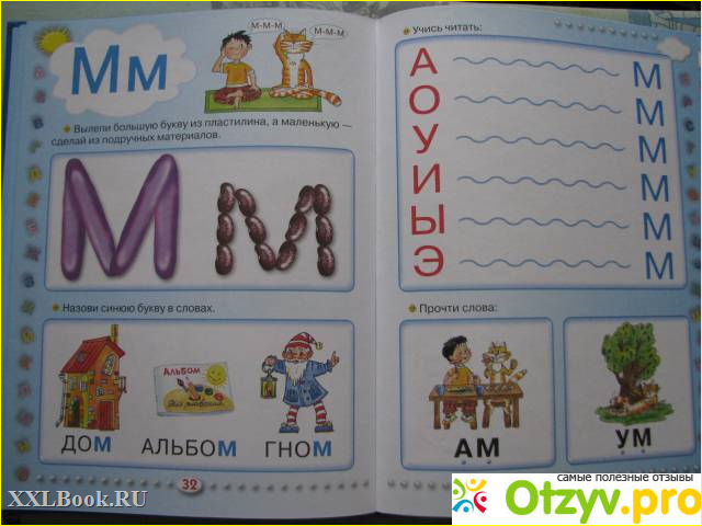 На странице книги представлены предложения в которых встречаются слова с буквой, и конечно они же представлены картинками. И так на все буквы алфавита по отдельности. Очень легкие предложения для повторения и запоминания. С легкостью запоминаются детьми от 2 лет.