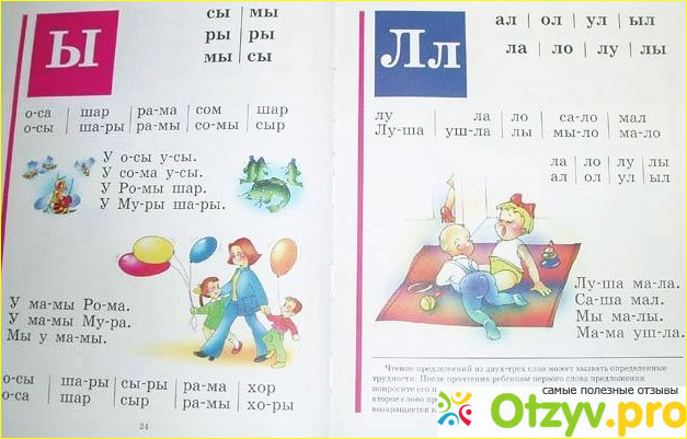 Стоит отметить, что автор учебного пособия- логопед с тридцатилетним стажем и разрабатывала Букварь в соответствии с основными логопедическими правилами. Это ощущается уже при выполнении первых заданий. Основными для изучения становятся проблемные буквы Р и Л. Букварь больше похож на альбом по развитию речи, особенно для тех деток, которые имеют проблемы с произношением ряда букв. Возможно, это плюс. Но мой сын (ему почти 4 года) выговаривает все буквы, может сам прочесть простые и короткие слова. Ему совсем не интересно было по несколько раз повторять Лара, Сара, Мара и тому подобное. Без присутствия красивых картинок это скучно вдвойне. Вообще, иллюстрации- это отдельная проблема в данном пособии. Нам они не пришлись по душе совершенно. Все герои со странными красными выпуклыми щеками, картинки идентичны, порой наблюдаются странные несоответствия (ребенок в теплом свитере и шлепанцах). Для кого-то это может быть абсолютно не важным моментом, но лично я обращаю внимание на оформление книг. Да и для детей в столь юном возрасте очень важно зрительное восприятие.