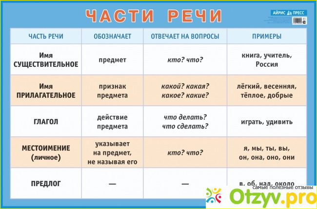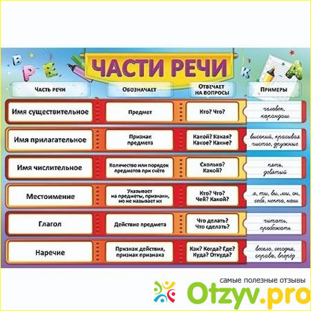 Но чтобы их выучить, нужно понимать, а чтобы понимать, нужно, чтобы в голове была схема, названия частей речи, понимать что это такое, а главное правильно различать подлежащее, сказуемое дополнение. Чтобы все это выучить, запомнить, а потом еще и применять, нужно хорошо ими владеть. И здесь то. И начинаются трудности, особенно для второклассника или первоклассника даже. А современное общество, требует идеальное знание русского языка. К тому же экзамены сдаются чуть ли не каждый год в каждом классе. Начиная с четвертого класса дети сдают экзамены по русскому языку, причем диктанты пишут с первого класса уже. Вообще независимо от возраста, нужен наглядный материал. И здесь начинается поиск важного дидактического материала. Вообще при выборе его нужно учитывать возраст учащихся. Мы знаем, что любой материал хорошо усваивается при помощи наглядного материала. Поэтому всевозможные карточки, картинки, плакаты нужны обязательно. Например, имя существительное. Наша задача понять, когда оно используется, на какие вопросы отвечает, в предложениях чес выражено иснижение конечно же примеры. но важно не только заучить. Вот этот плакат Айрис вообще я считаюотличным. Во-первых, он яркий, что очень хорошо способствует запоминанию частей речи. Все части речи оформлены в виде таблицы, где есть название, на какие вопросы отвечает, описание, и примеры. На мой взгляд, в нем разберется даже двоечник. Все подробно описывается, а главное показывается. Есть и другие плакаты, но мне кажется, что этот наиболее понятный и простой для запоминания. А как известно, чем проще, тем лучше. Также хочу отметить, что данный плакат хоть и называется плакат части речи для начальной школы, его используют в институтах для обучения русскому языку иностранцев. Почему я так говорю, потому что сама там работаю, и часто видела как данный плакат использовали мои коллеги, когда объясняли материал студентам иностранцам. Поэтому как видите плакат части речи для начальной школы можно использовать не только ученикам, но и людям взрослым, так как он является доступным материалом для запоминания и понимания трудного, но очень интересного русского языка.