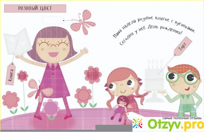К примеру, страничка с розовым цветом. На нее ребенку нужно найти среди наклеек и приклеить книгу, которая у мамы в руке, торт, который держат дети и также нужно найти указатель с надписью "кукла" и приклеить на свое место. Тем более все детки любят наклейки и сам процесс наклеивания для детских пальчиков очень хорош, так как развивает моторику и движения у ребенка координируются, а это в свою очередь также положительно сказывается и на общем развитии ребенка и его дальнейшей успеваемости.