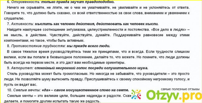 В книге предлагается десять основных принципов, которыми должен руководствоваться настоящий лидер компании. На мой взгляд, принципы слегка пафосные и какие-то мутные, но далее в книге они подробно расписываются, и понимаешь, они то, что надо..