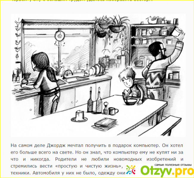 Все вроде бы как обычно – английский мальчик живет себе в небольшом доме, правда с необычными родителями, дело в том, что они не используют электричество и его вообще нет в их доме, они как только могут защищают природу и ее богатство, не питаются тем, что продают в магазинах, а только тем, что есть у них на огороде, всячески негативно относятся к научному и науке в целом! А сынишка как и всякий другой мальчик мечтает о компьютере, он хочет жить так как все и сбежать от таких родителей. Я бы тоже сбежала наверное, это же ненормально, все таки, согласитесь – противиться тому, что есть на земле и отрицать явные вещи и знания!!! В школу они все же своего сына отдали, несмотря на свои непонятные рассуждения! Они запрещали ему все, кроме школы, даже печенье, о котором ребенок мечтает!!! На соседний участок кстати ему тоже было запрещено бегать, а вот на нем то как раз и все началось! Дело в том, что у мальчика был один друг – не смейтесь, это поросенок Фредди, так вон поросенок однажды сбежал, и Джордж его нашел как раз на запрещенном родителями участке у соседей. Там все и началось, в этом доме живее очень умный папа ученый, и в этом доме даже компьютер есть, соответственно и электричество!...