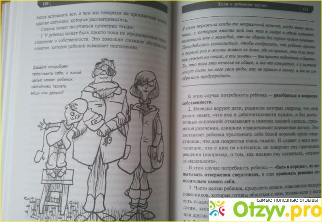 Книга "Если с ребенком трудно" не похожа на остальные книги по воспитанию детей. Зачастую, в таких книгах написано все очень серьезным, научным языком, все детально описано с помощью терминов, схем и таблиц. Такой стиль написания сразу отбивает у меня охоту читать такое пособие длительное время, к тому же мой мозг, мозг рядового человека, не академика , не совсем воспринимает и понимает все эти термины, которые , по сути, мне и не нужны. В книге "Если с ребенком трудно" вся информация подается очень простым языком и это самый большой ее плюс. Она написано даже в слегка шутливой форме, что делает ее прочтение интересным, нескучным и захватывающим. Каждый раздел книги украшен смешными карикатурами, изображающими трудные ситуации в семье, например, родители с автоматом и базукой, которые устали бороться с непослушными детьми. Такой подход позволяет мамам и папам отнестись к своим проблемам с иронией и не воспринимать их на столько серьезно.