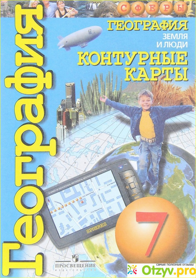В целом обложка яркая и красочная выполненная в современном духе. На переднем плане - навигатор, сзади - огромные высотные здания, парящий в небе дирижабль и пацан, веселый и прыгающий на глобусе! Это как раз самое то, что нужно семиклассникам, которые уже успели устать от учебы и такая обложка придаст им новых сил и, возможно, заинтересует и привлечет внимание к самому предмету.