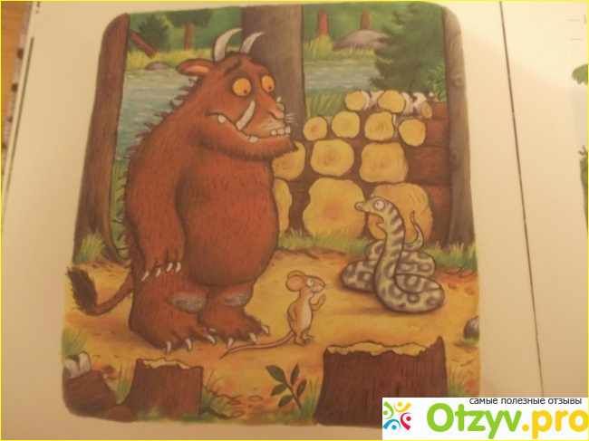 Не хочу спойлерить, дальше прочитаете самостоятельно. Слог простой, можно даже по ролям книжку читать. Иллюстрации приятные глазу, их автор — Аксель Шеффлер, к слову, почти все книги Джулии Дональдсон оформлены этим художником. Детям очень нравится эта сказка, читаем часто, чуть ли не каждый день. Причём она отлично зашла как шестилетнему младшему, так и двенадцатилетнему старшему ребёнку.