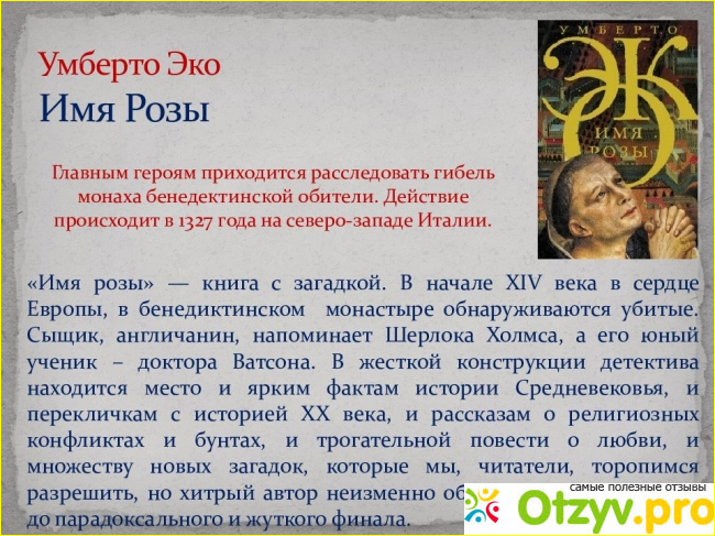 Имя розы - первый роман Умберто Эко, итальянского писателя, профессора семиотики Болонского университета.