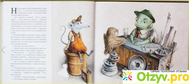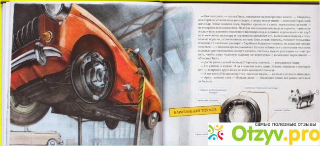 В книжке подробно описано всё, прям , более подробно я ещё не увидела ни в одной другой! Книжка описывает , историю двоих закадычных друзей - мышки "Арни" и воробушка "Билла", как они однажды решились собрать автомобиль. К ним-же присоединяется маленькая лягушка "Кристиан", у которой есть магазинчик с запчастями, что очень-уж облегчает друзьям сборку автомобиля. В общем, как-бы с самого начала выходит, что Арни (мышонок) стал - изгоем из-за своей хромоты, но после он становится известным всем только благодаря тому, что у них с Биллом (воробьем) сделан очень крутейший техно-проект. И малышу в удачной форме внушаются мысли, что если он сможет разобраться в любой машине и вообще в механизмах, то он станет всегда востребованным! Не знаю, обоснованно ли это, но в наше время, если вы плохо разбираетесь в машине - это не очень то и прилично, а книжка как раз и даёт ребёнку шанс, научиться разбираться в машинах и том как они устроены на очень хороших, для ребёнка уровнях. Даже я поняла с её помощью многие нюансы в устройстве автомобилей и то, что я совсем не могла-бы ранее понять и потом ещё объяснить как это работает. А теперь могу! Объясняет эта книжка всё простым и наглядным образом. И это всё очень и очень ПОДРОБНЕЙШИМ ОБРАЗОМ! А для нас-же это является основным плюсом книжки!