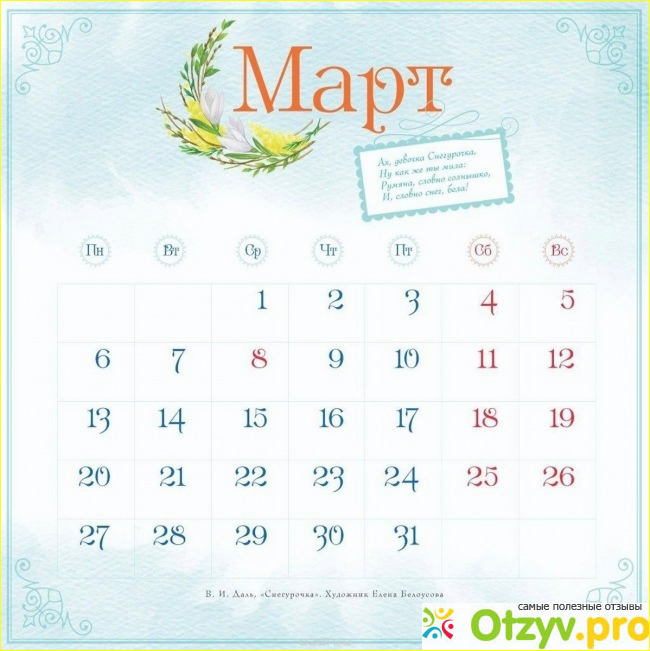 Сверху у календаря идет мягкая обложка и сам он идет весь полностью на скрепке. Всего в этом календаре находится 24 страницы. Странички быстро и легко переворачиваются и на каждый месяц перед ребенок образуется все новая и новая сказочная картинка, которая будет радовать глаза целый месяц.