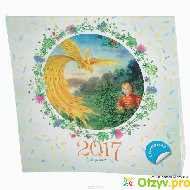 Сам календарь имеет довольно не маленький формат и становится он на стол. За счет небольшой подставочки, которая есть у него внизу. Спереди у календаря идет обложка на которой нарисован рисунок из одной сказки, а именно Иван царевич и Жар птица. Уж эту сказу знают практически все дети.