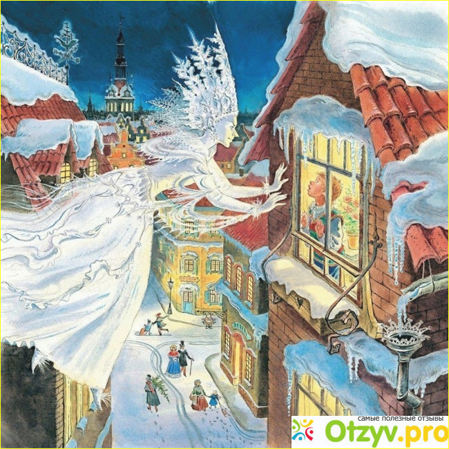 Иллюстрациями на зимние месяцы служат изображения со Снежной Королевой, которая, кажется, собралась заморозить всех и вся, не оставив живого места! Снежная королева подлетает к окнам, заглядывает внутрь, словно хочет заморозить не только тех людей, которые вышли на улицу, но и тех, что находятся внутри своих уютных домиков.