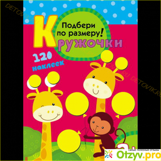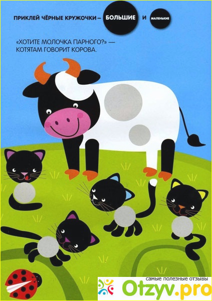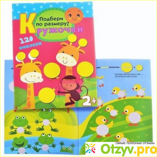 Я однозначно могу рекомендовать данную развивающую книгу, поскольку, несмотря на ее простоту и небольшой размер, пользы от ее изучения очень много. Книга развивает мелкую моторику и координацию, помогает разобраться с такими понятиями, как большой и маленький, знакомит нас с основными цветами. Могут возникнуть сложности с тем, чтобы правильно подобрать кружочек по его размеру, но для этого рядом всегда есть вы. Кружочки крепятся очень легко и их можно переставлять. Вверху страницы есть даже подсказки, какого цвета и размера нужен кружочек для данного задания. Да я и не знаю детей, которые не любят наклеек. Удобно и то, что не нужно ничего вырезать, наклейки уже подготовлены.