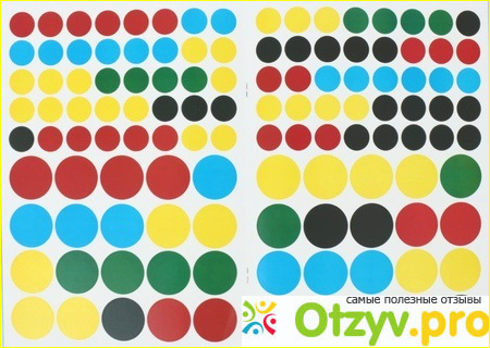 Всего наклеечек-кружочков 120 штук, все они разного размера и цветов ( желтые, зеленые, красные, синие и черные). Соответственно, параллельно мы еще и учим цвета. Мой сынок говорит еще не очень внятно, но цвета мы учим с двух лет и сейчас он спокойно может назвать минимум 10 основным цветов. Посторонним людям не всегда понятен его язык, но я то знаю, что называет он их абсолютно верно.