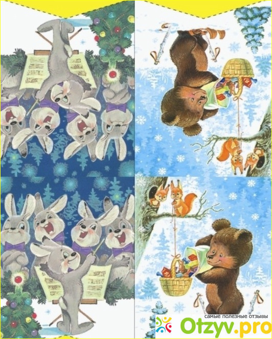 Конечно, это замечательно подобранные образы. Название подобрано просто идеально. Все картинки на самом деле из детства. Хорошего, запоминающегося и яркого. Милый и добрый медвежонок встречается несколько раз. У него много работы, то этот неуклюжий зверек очень умело наряжает елку, вешает на нее разные игрушки. На другом флажке он подталкивает снеговика на гору. Еще на одном он просто веселиться, катаясь на санках. Глядя на веселого медвежонка, сам начинаешь улыбаться. А как поднимает настроение колючий ежик-лыжник. Красная шапочка и варежки помогают ему согреться в мороз.