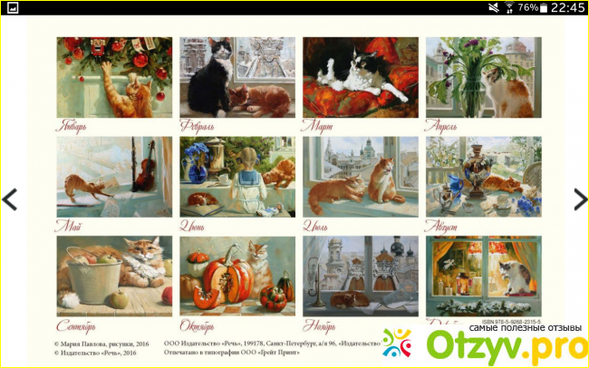 Роскошные, да что там, просто шикарнейшие коты грациозно потягиваются, мирно спят, приводят себя в порядок, охотятся, подобно их более крупным кошачьим собратьям, величественно восседают на подоконниках ... Что характерно для данного календаря - он рисованный, то есть, это именно портреты котов и кошек, которые были нарисованы художником. Я в пиинципе ничего не имею против и фотопортретов котов и кошек, но вот такие рисованные, на мой взгляд, как-то душевнее, что ли. Автор этих симпатичных котопортретов - иллюстратор Мария Павлова.