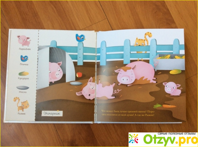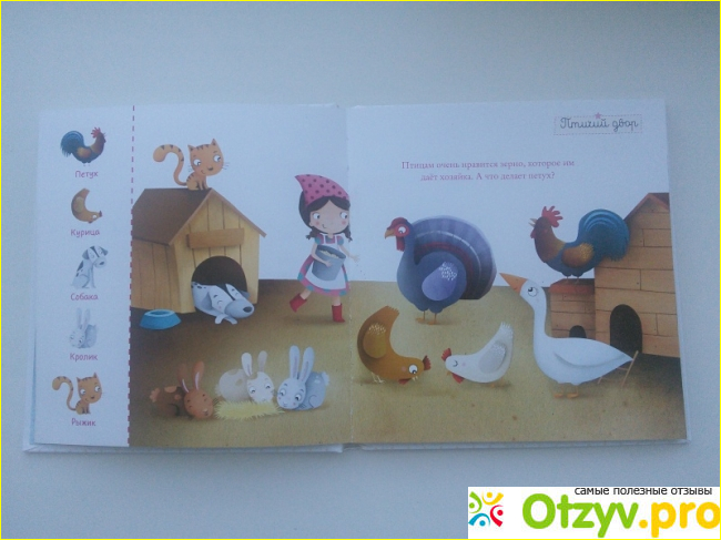 Милый симпатичный герой книги проводит нас с первой до последней страницы книги. Его также можно находить и показывать на каждой страничке, заодно знакомясь с темой рассказа: как живут куры, лошадки, овечки — все это ребенку наглядно демонстрируют красивые иллюстрации книги.
