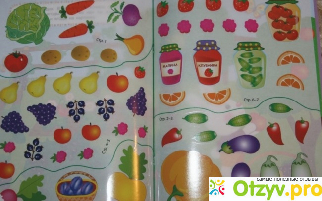 А еще на помощь придут очень красивые и яркие наклейки, которые находятся во вкладыше в середине книжечки. Наклеечки очень красивые и яркие. На них изображены овощи, фрукты, баночки с вареньем. И если ваш ребенок еще не знает все фрукты и овощи, то благодаря таким наклейкам, он сможет быстро все запомнить. Наклейки снимаются очень легко и ребенку не составит труда самостоятельно их отрывать и с этим заданием он справится очень легко. Наклейки очень хорошего качества, они не будут скручиваться, рваться, тем более, что они многоразовые и ребенок сможет еще много раз играть и выполнять эти задания.