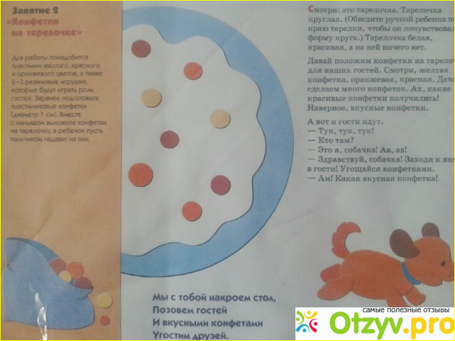 Здесь нужно было положить разноцветные кружочки-конфеты для собачки. Параллельно повторяем как говорит собачка - "ав-ав". На одном развороте нарисован пример, а на другом нужно прилепить подготовленные шарики на чистую тарелку.