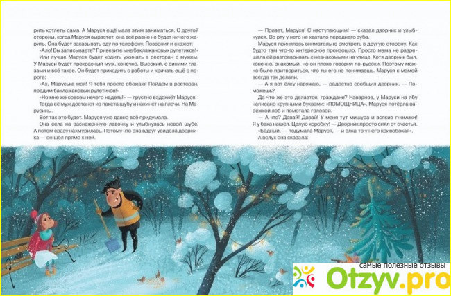 Сама книга небольшого формата. Ее размеры 20х26 сантиметров. В книге 80 страниц. Иллюстрации такие же красивые, как и обложка. Вот на примере одной страницы можно судить о качестве издания и оно хорошее. Поэтому такая книжка станет хорошим подарком ребенку, особенно на замечательный праздник Нового года.