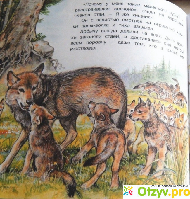 В весьма доступной форме ребенку объясняются такие вещи, как жизнь волчонка в лесу, в логове, в стае. Рассказывается, как охотятся серые хищники, как ведут себя друг с другом, как живут и что делают весной, летом, осенью или зимой, при этом автор очень аккуратно обошел жестокие моменты из "биографии" волков. Читая книгу, дети, что мастера фантазирования, легко проникаются атмосферой рассказа, "включая" воображение, комментируя, радуясь победам главного героя (личный опыт). История словно и реалистично описана/нарисована, и в то же время выполнена в виде эдакой сказки о природе.