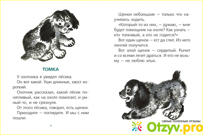 У одного песика появились не свет щенки, но все разные! Один был слишком ленивый, другой — слишком сердитый, третий — чересчур ласковый. А четвертый — Томка. Томка был настоящим охотничьим псом! В коротеньких рассказах про Томку мы можем наблюдать, как он растет, познает этот мир, учится на своих ошибках. Ребенок должен мысленно отождествлять себя с этим героям, стремясь быть таким, как он, стремясь понимать, как же интересно узнавать каждый раз что-то новое о нашем мире! А вот другим щенкам ребенок должен себя противопоставлять, ведь лень, злость и чрезмерная ласка (тут явно подразумевается лесть) — это то, что должно прочно ассоциироваться у ребенка с плохой моделью поведения, которую он перенимать точно не захочет! Именно благодаря коротеньким рассказам Евгения Чарушина ребенок и учится таким, на первый взгляд, простым вещам. И знаете, я считаю, что читать подобные книги для ребенка в детстве намного полезнее, чем, допустим, включать всеми обожаемую «Машу и Медведя». Ведь дети действительно слишком восприимчивы, а потом родители еще удивляются, почему они становятся такими же непослушными и неуправляемыми, как Маша.