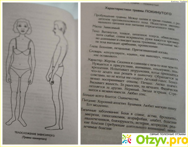 В книге Лиз Бурбо говорится, что всего существует пять травм: отвергнутого, покинутого, униженного, а также травма предательства и травма несправедливости. И каждый человек, имеющий ту или иную травму, похож на другого индивида, страдающего от той же травмы. У них практически одинаковые маски! Это выражается даже во внешности. Приведу пример: травма покинутого. Он носит маску зависимого. По характеру является жертвой (это про меня). Самый большой страх — это одиночество. И опять четкое совпадение! Именно страх одиночества и заставля меня выбирать... не тех мужчин. Вот описание его глаз зависимого по Лиз Бурбо: